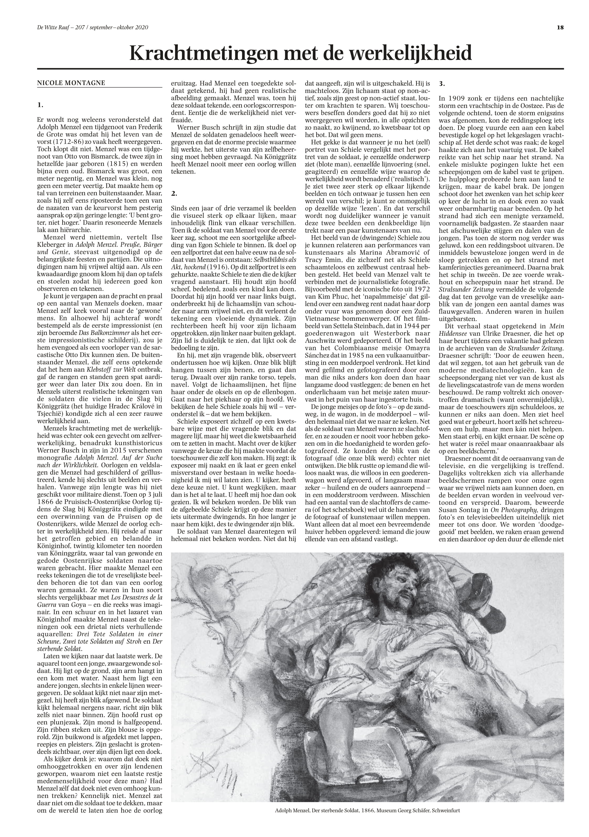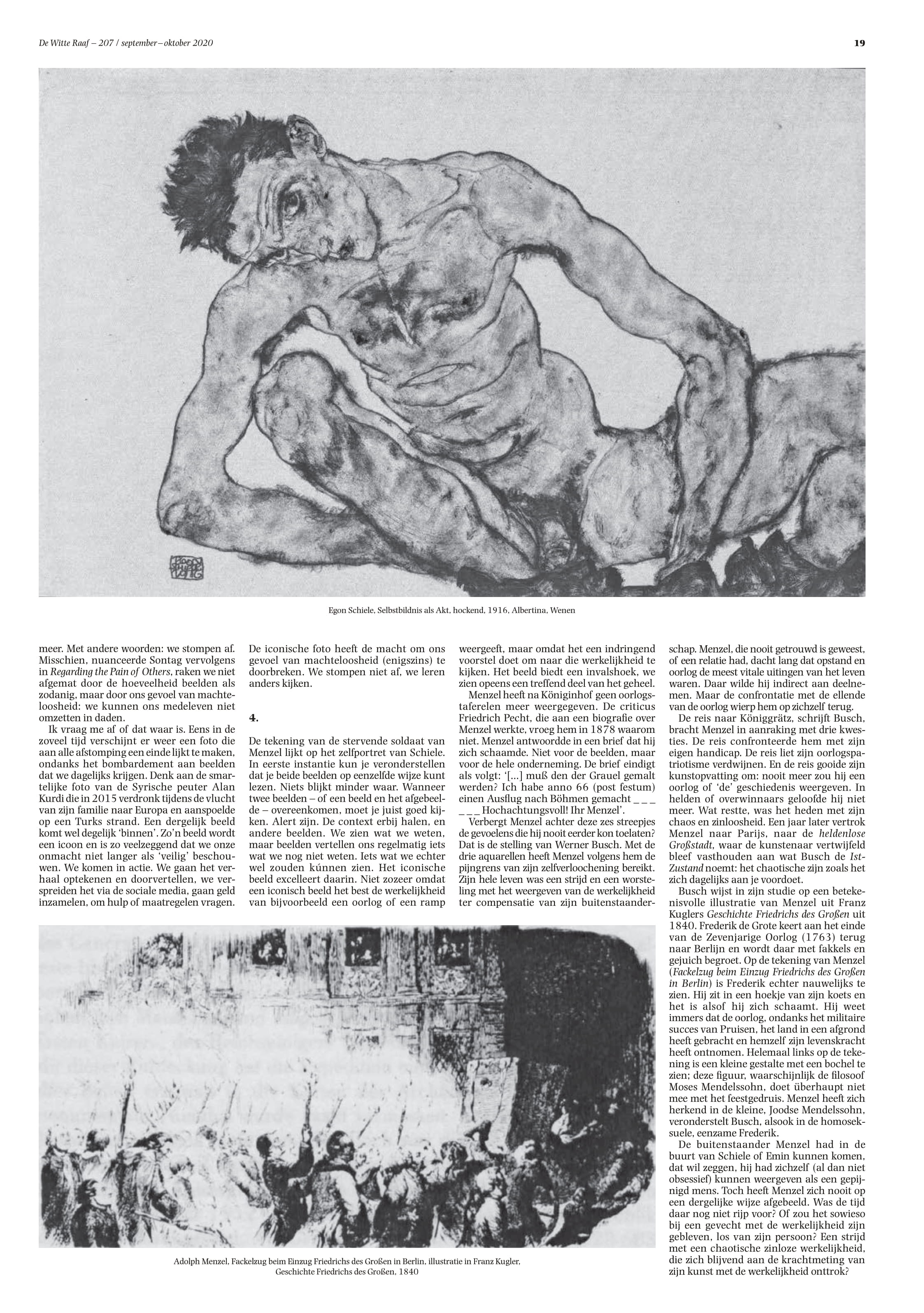 Adolf Menzel heeft zich nooit, zoals Egon Schiele, afgebeeld als een gepijnigd kunstenaar. Over de sterk picturale overeenkomsten, maar vooral de verschillen, tussen een zelfportret van Schiele en de tekening van een stervende soldaat door Menzel, schrijf ik in de nieuwste editie van De Witte Raaf.